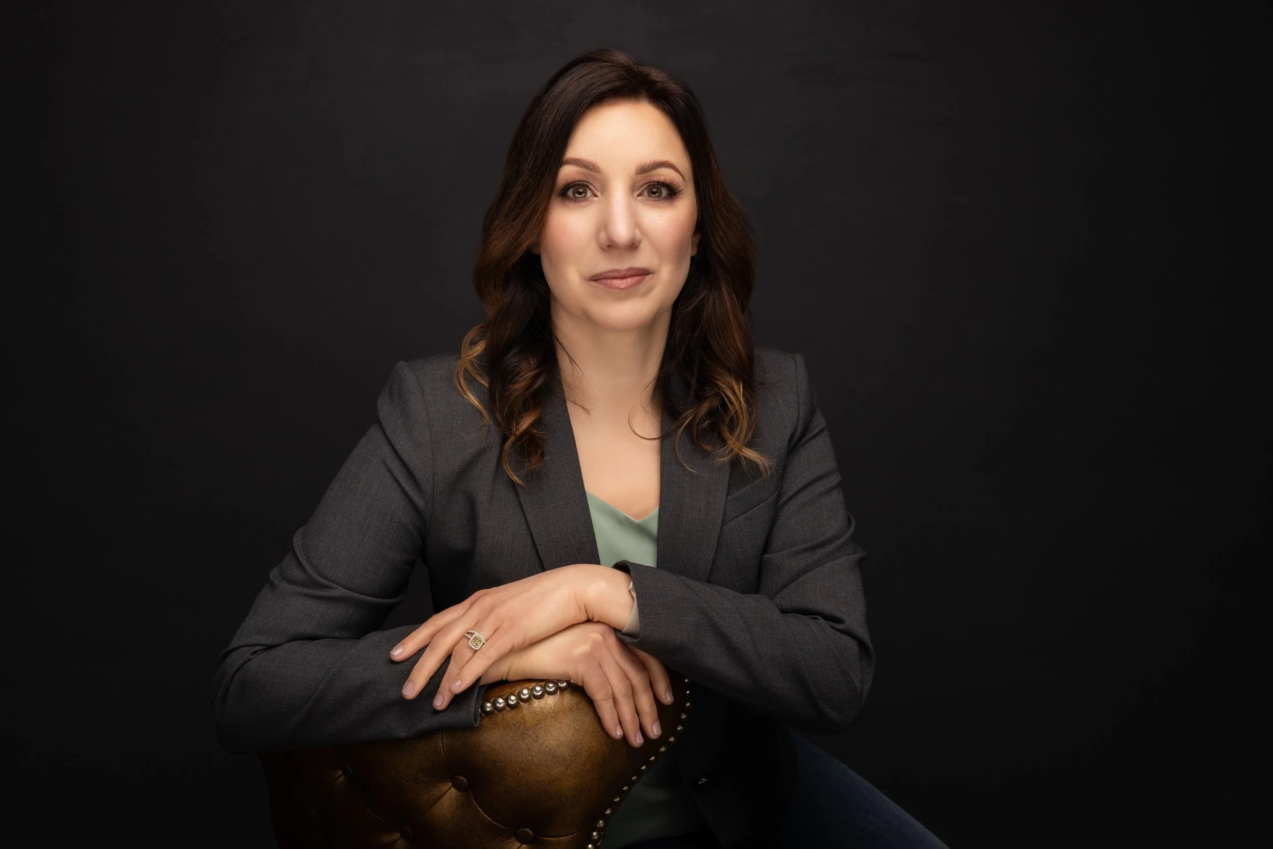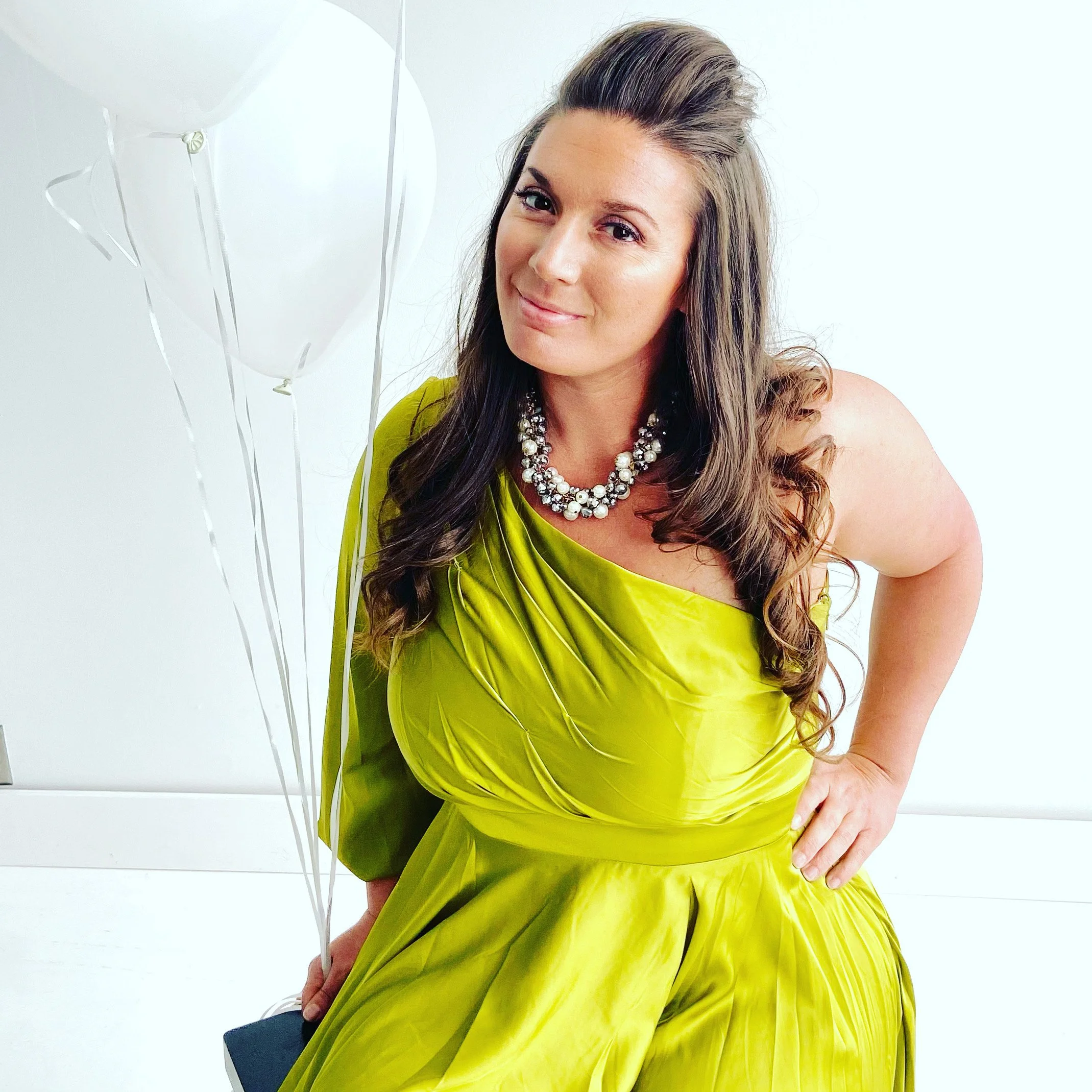 A woman with shoulder-length brown hair, wearing a black top with a lace-up neckline and a blue plaid shirt, standing in front of an ornate gold mirror and next to green plants.