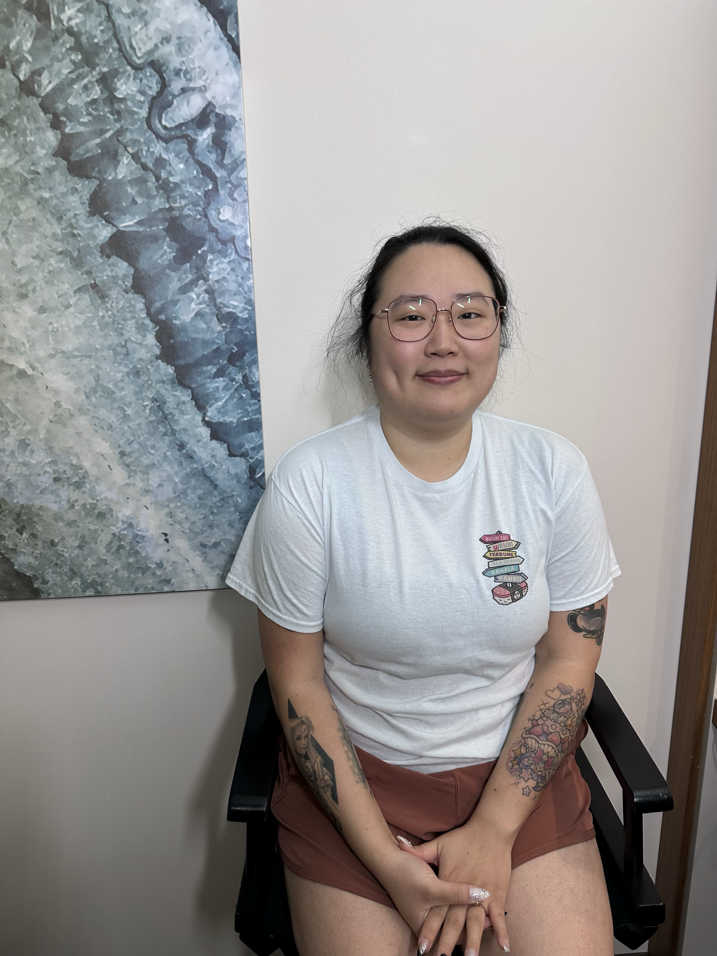 A woman with dark brown hair, wearing a pink t-shirt with colorful text, sitting in a room with large houseplants and an ornate gold mirror.