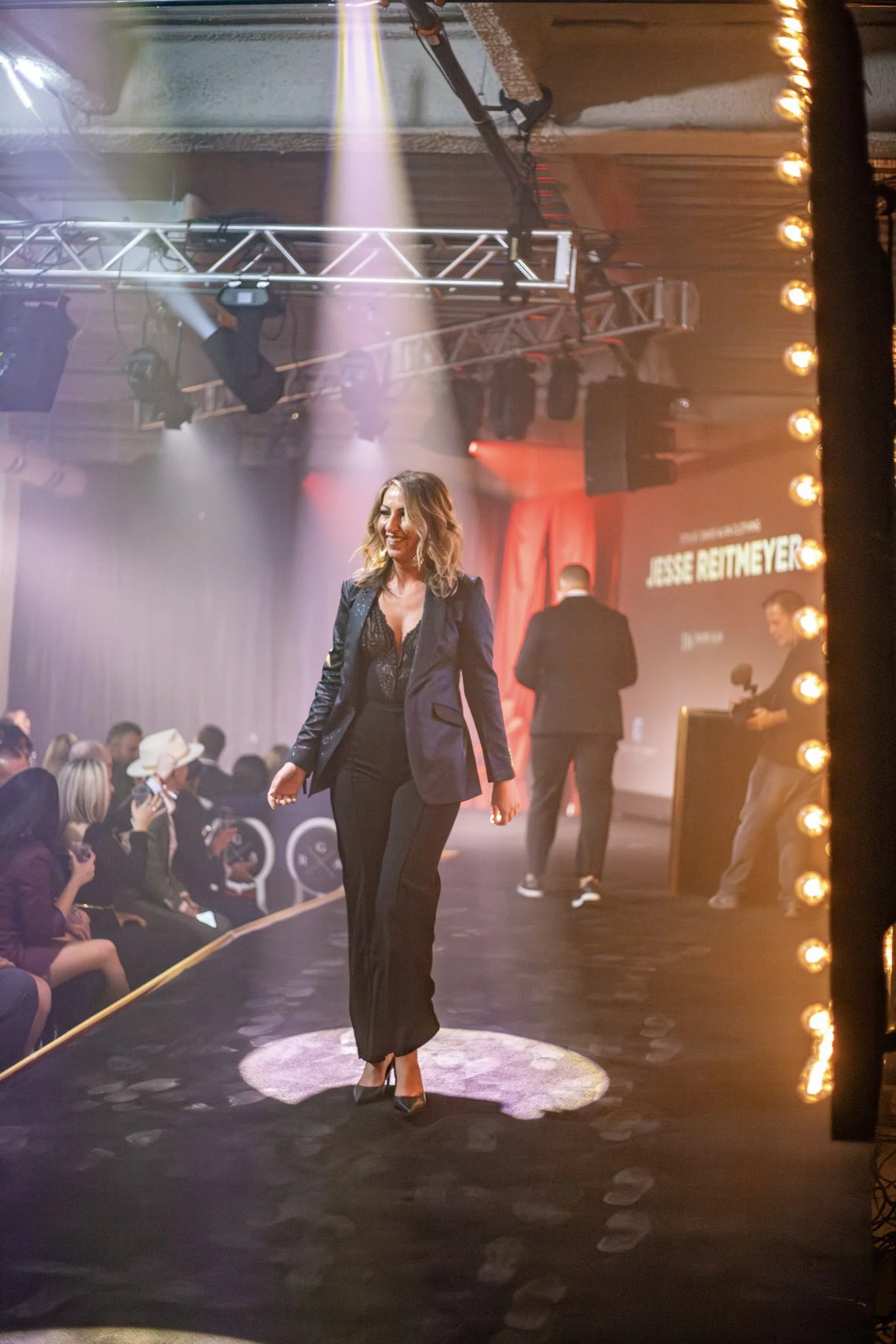 A woman with long blonde wavy hair wearing a black sleeveless top, standing in front of a decorative ornate mirror with a silver frame, surrounded by green indoor plants.