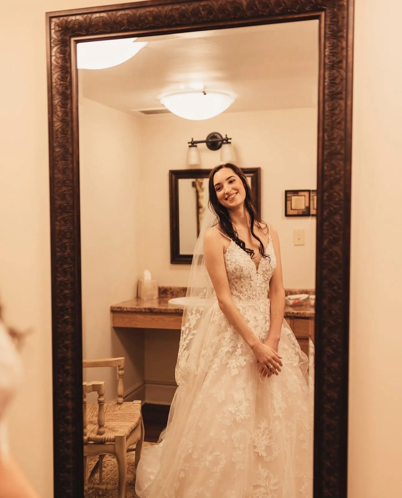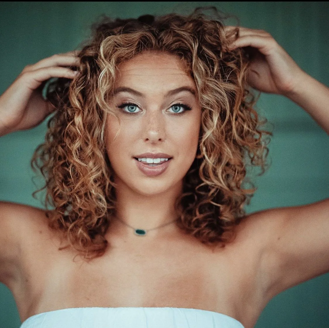A woman with blonde, wavy hair smiles at the camera. She is wearing denim overalls over a white tank top and a delicate necklace. The background features greenery and a large ornate mirror.